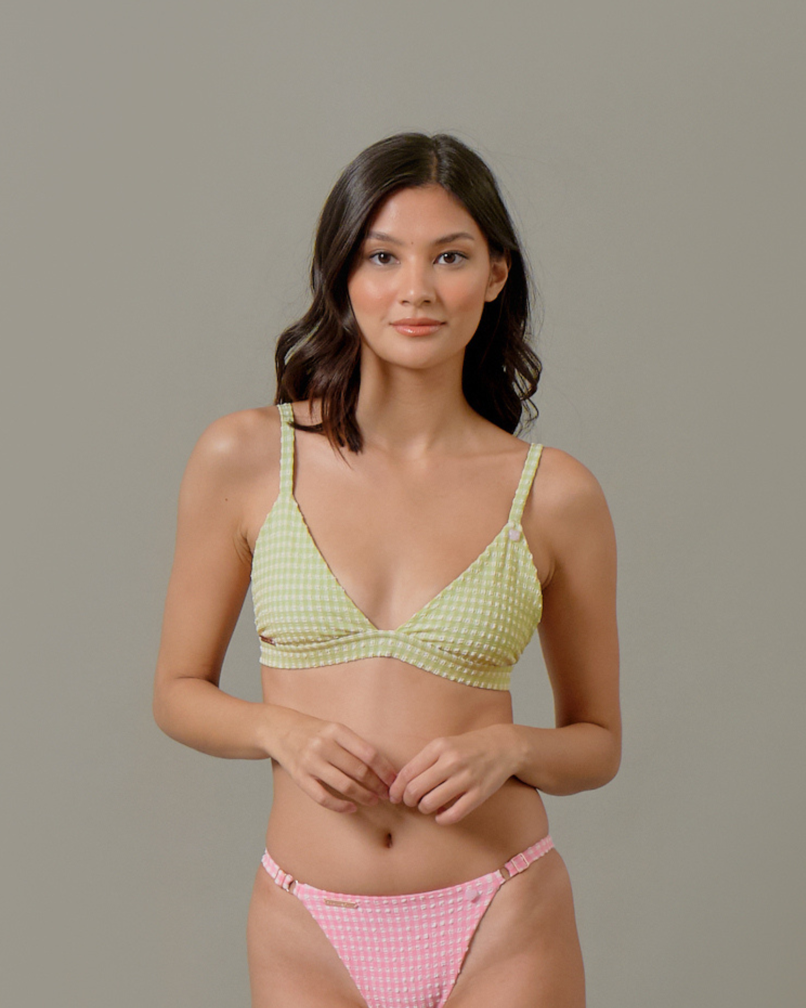 Our bestselling bralette style top looks good on everyone. Featuring double layered luxuriously soft fabric and supportive cups with adjustable straps. Bra pad insert slits mean that you can add your favourite bra padding if you want to. A large, luxurious rose gold clasp and rose gold bra strap adjusters give this bikini top an ultra luxe finish.The Ariella top looks great on small to large busts and offers good bust support.