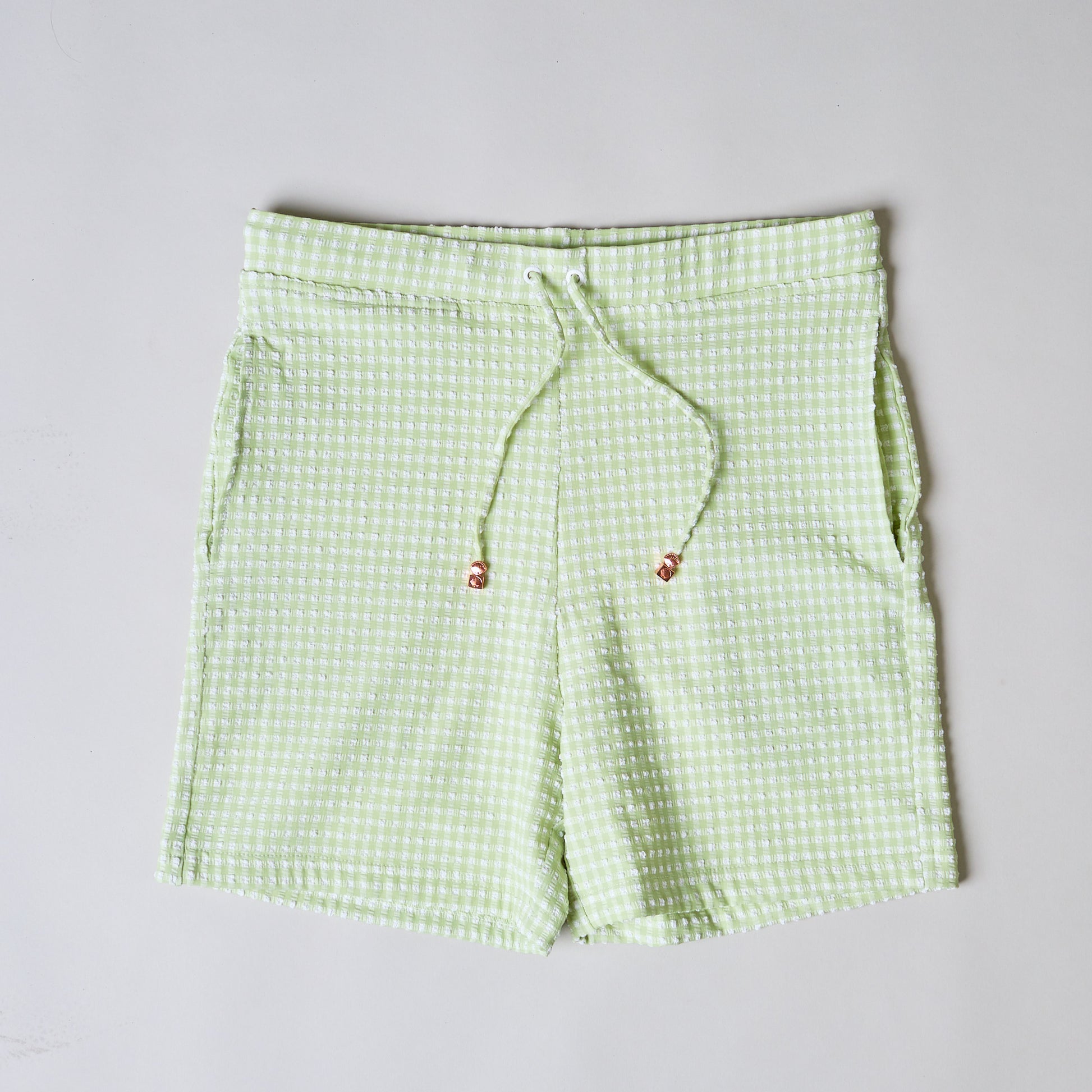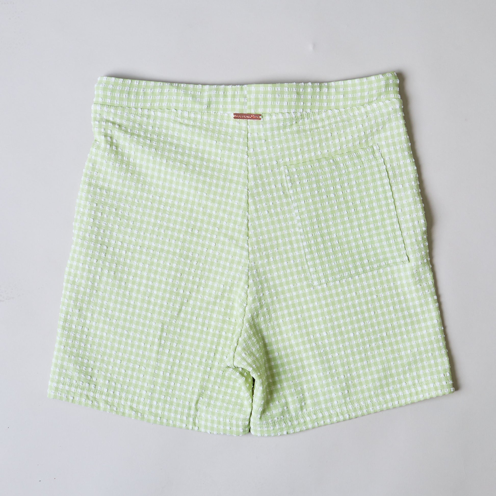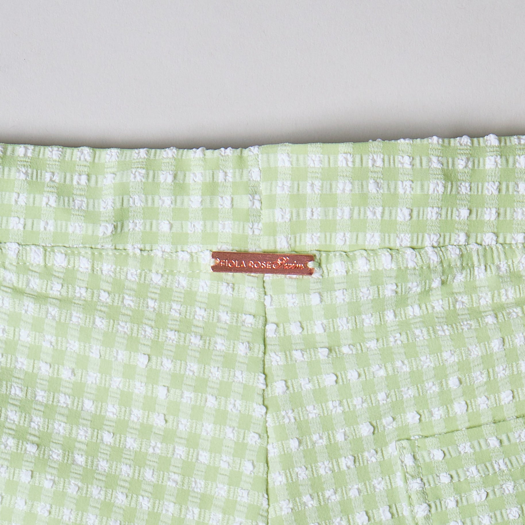 Our Men’s swim trunks are made from our classic seesucker gingham fabric and are fully lined for comfort. They feature side pockets and a back pocket. Rose gold hardware on string ties.