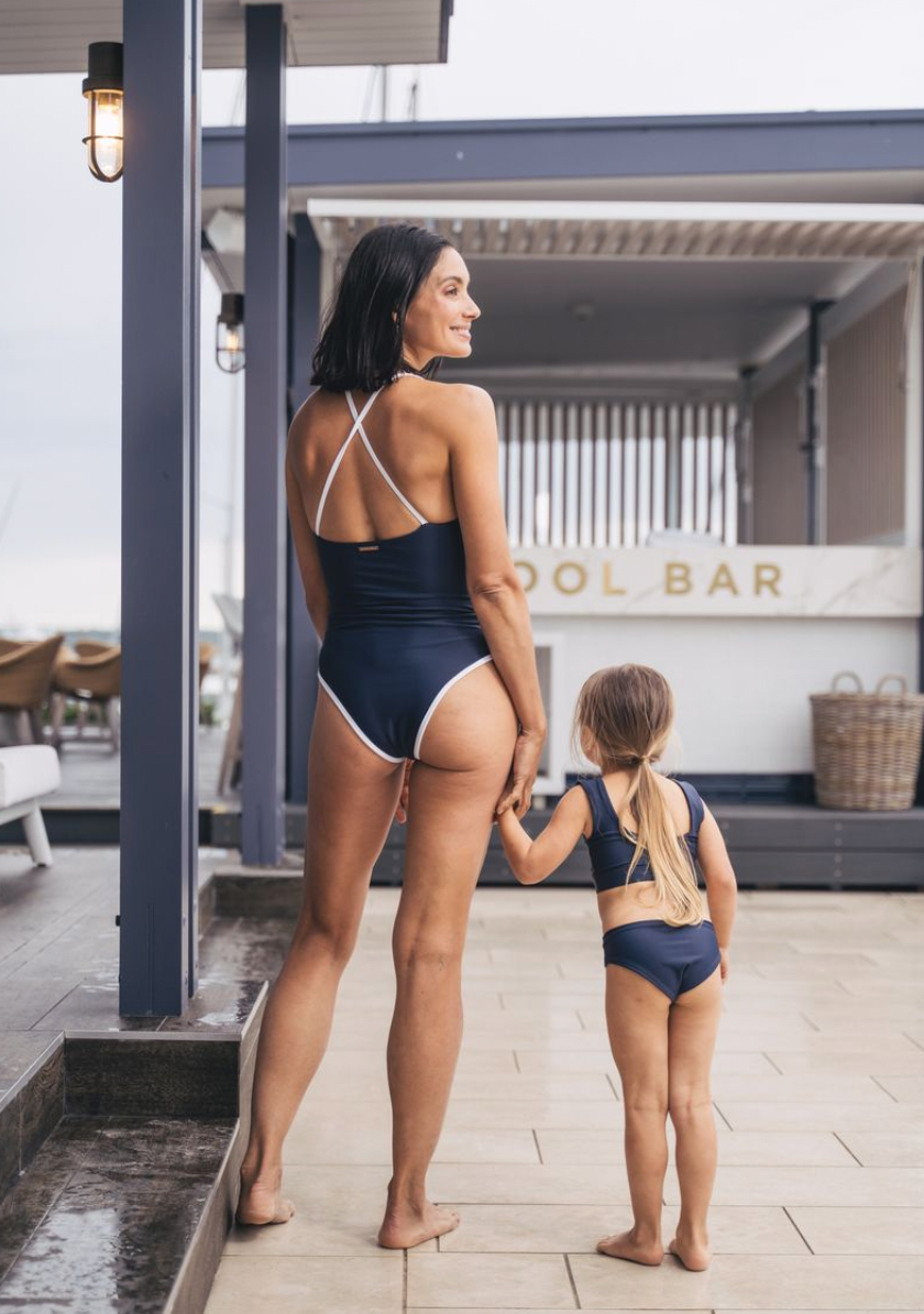 Pia One Piece features luxurious double layered fabric. Our classic sport luxe one piece features an in built shelf bra (triple layered) cross over straps and a form fitting, flattering style that supports every curve. Designed with aqua sports in mind this swimsuit suits all body shapes and sizes. Medium leg cut and moderate bottom coverage.