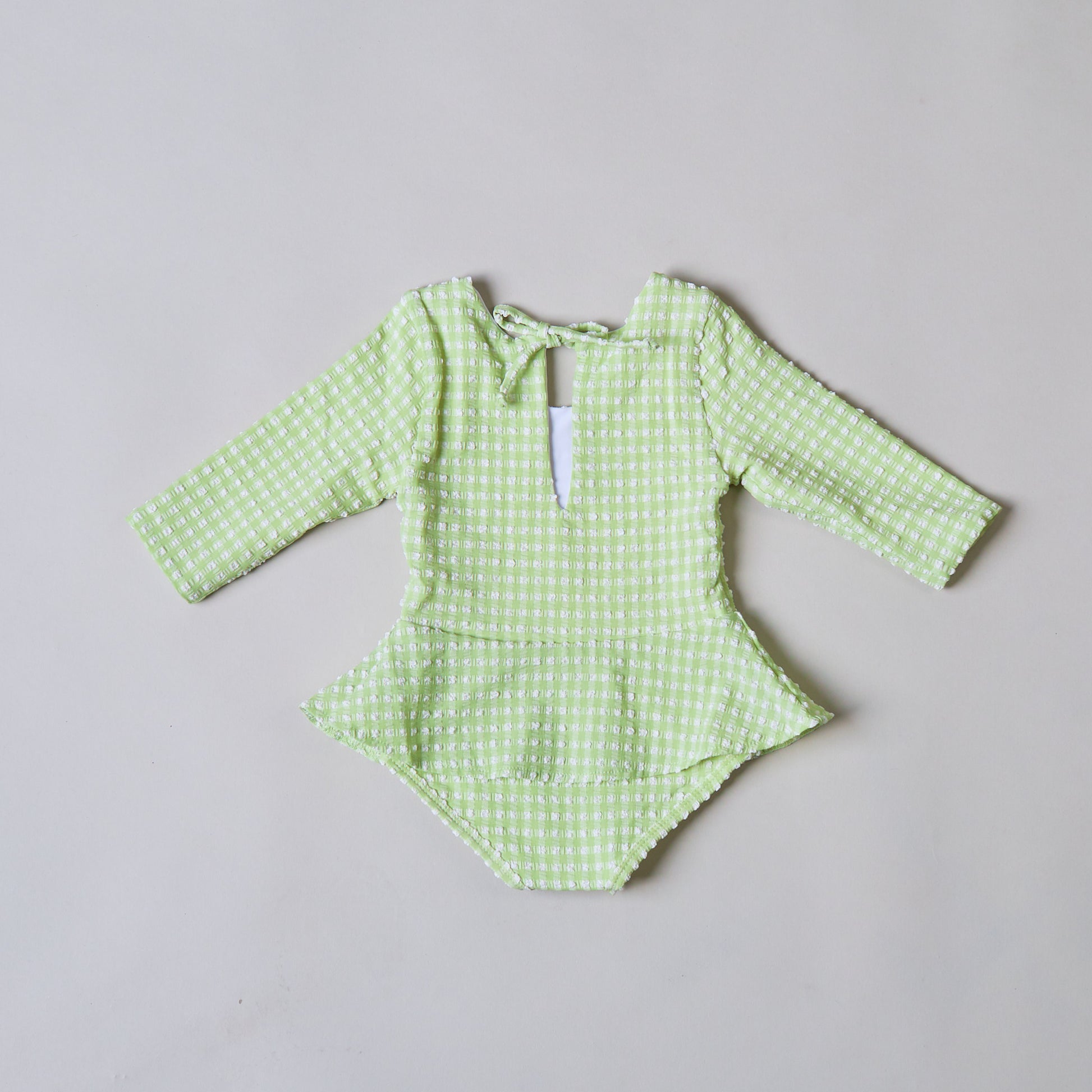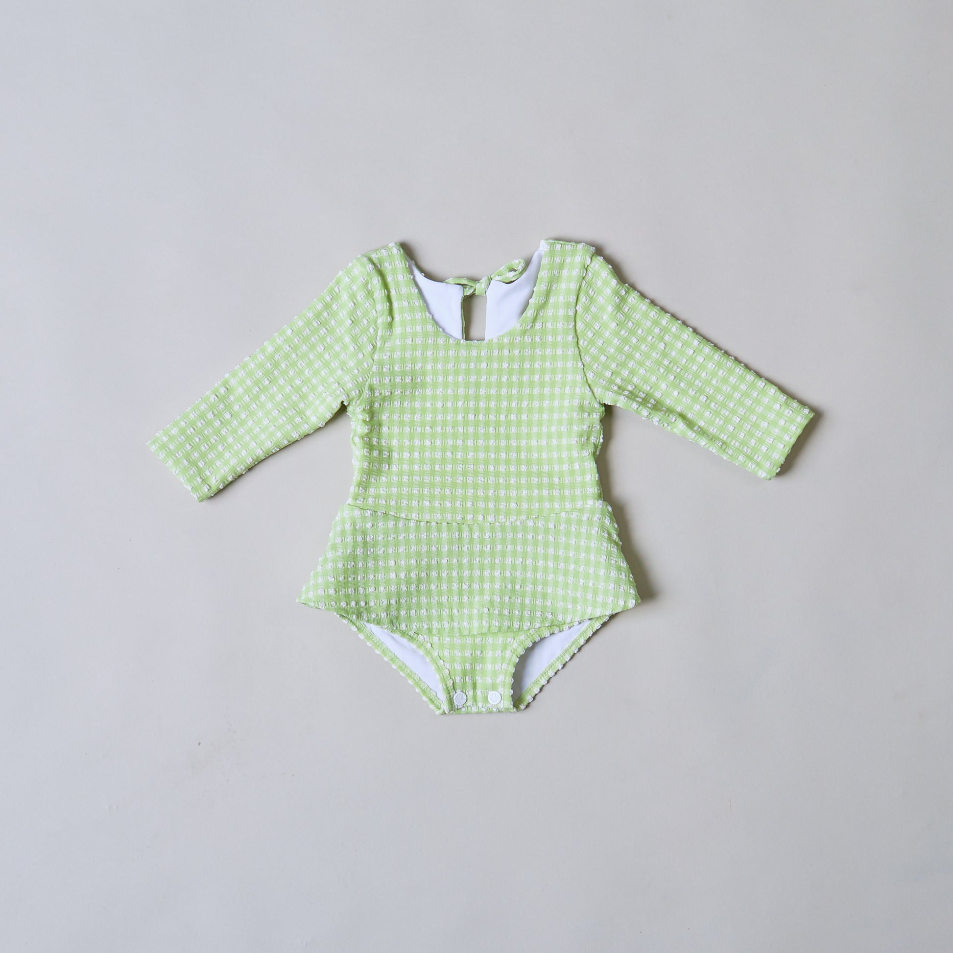 Lovingly handmade swimwear for girls. The Polly one piece features sun smart long sleeves, double thickness, soft fabric for protection against the elements as well as our signature rose gold hardware and semi precious rose quartz crystal attached.